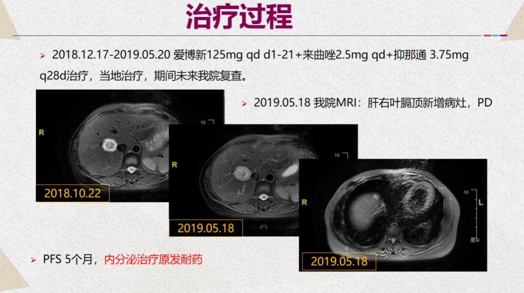 该例患者应用CDK4/6抑制剂+AI的方案出现疾病进展,因为肿瘤异质性的存在,患者的分型可能存在差异,因此,我认为对于该患者应重新进行活检,并推荐其进行基因检测。若患者拒绝行基因检测,我可能会根据患者身体的情况,应用化疗方案降低患者的肿瘤负荷,后续再行内分泌+靶向维持治疗,后线治疗会选择ADC类药物。