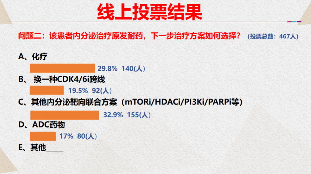 网上医生投票结果揭晓:32.9%的医生网上投票建议选择其他内分泌靶向联合方案(mTORi/HDACi/PI3Ki/PARPi等),29.8%的医生网上投票建议选择化疗方案。