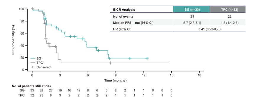 在肿瘤缓解方面,SG组较TPC组客观缓解率(ORR)提升至10倍(30%vs 3%)。其中,SG组中1例患者完全缓解(CR),9例患者部分缓解(PR);TPC组没有患者CR,1例患者PR。SG组临床获益率(CBR)为TPC组的7倍【42%(14/33)vs 6%(2/32)】。由此可见,SG较化疗可改善mTNBC生存状况,为mTNBC二线治疗带来了更优的临床选择。