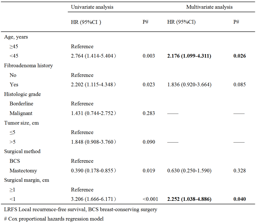 研究方法:我们回顾性分析了2011年3月至2023年12月在重庆医科大学附属第一医院治疗的交界性及恶性叶状肿瘤患者。本研究的主要终点是局部无复发生存期(local recurrence-free survival,LRFS)和无病生存期(disease-free survival,DFS)。采用Kaplan-Meier法估计LRFS和DFS率,并对每个亚组的生存曲线进行log-rank检验。使用单变量和多变量Cox比例风险模型来检验不同变量对LRFS和DFS的影响,并计算风险比(HR)和95%置信区间(CI)。