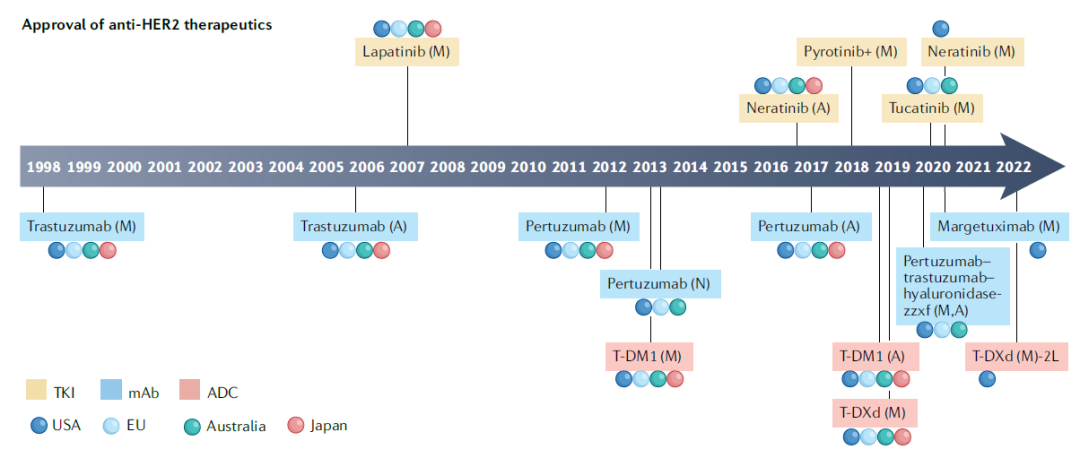HER2作为一种高度敏感的治疗靶点,经过既往长期的探索发现,已然成为治疗高度侵袭性HER2阳性乳腺癌(HER2+BC)的重大突破。首个HER2靶向药物——曲妥珠单抗在近25年前获问世,从此开启了HER2靶向治疗的新时代。自那时起,单克隆抗体、酪氨酸激酶抑制剂和针对HER2的抗体-药物偶联物(ADC)的多项临床试验相继公布且令人印象深刻,进一步催生了新的技术研发平台和更有针对性的疗法的进一步拓展。Swain等在2023年《Nature Reviews Drug Discovery》杂志上发表了一篇针对HER2阳性乳腺癌治疗进展与展望的综述[1],系统讨论了目前HER2阳性乳腺癌的治疗标准以及新的治疗方法和药物发展与展望。《肿瘤瞭望》特邀北京大学肿瘤医院梁旭教授对综述核心内容进行深入解读。