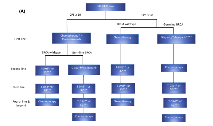 随着T-DXd在DB04试验中对所有HR+患者(包括HR阴性)有效,并被批准用于HER2低表达乳腺癌,无论HR状态如何。然而,该批准提出了一个关于T-DXd与其他标准治疗的最佳排序策略的问题。今年5月发表在Cancer上的一项研究对此进行了探讨。研究者利用目前文献中的证据,分别对T-DXd与戈沙妥珠单抗(sacituzumab govitecan,SG)、alpelisib、依维莫司(everolimus)、多聚ADP核糖聚合酶(PARP)抑制剂等其他当前疗法的结局进行讨论,以指导HR+和HR-/HER2低表达转移性乳腺癌的最佳治疗排序策略(如下图)[4]。研究主要发现有: