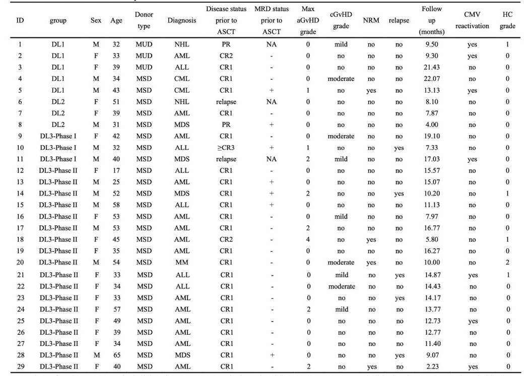 第一阶段共纳入11例患者(DL1有5例,DL2有3例,DL3有3例),无患者发生III-IV级aGvHD。在此基础上,选择DL3作为II期PTCy剂量,共18例患者。共纳入29例患者(女17例,男12例),中位年龄39岁(17-65岁),中位随访时间12.7个月(2.2-22.1个月)。患者和疾病特征见表1。移植后第30天,所有患者均达到完全缓解(CR)和微小残留病(MRD)清除。移植后100天内无一例患者发生III-IV级aGVHD。