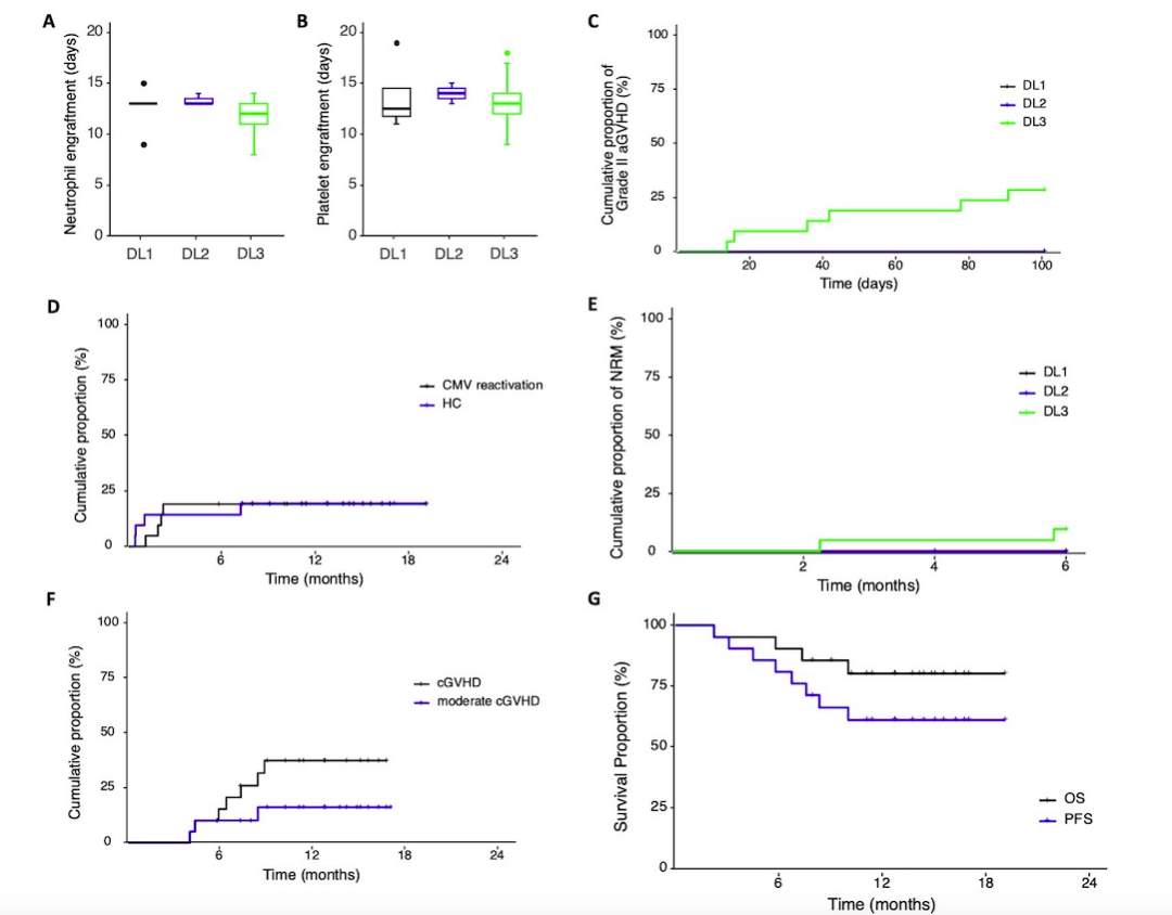 II期研究为基于I期研究确定的最佳剂量的扩展队列。aGvHD分级采用西奈山aGvHD国际联盟(MAGIC)标准,慢性GVHD(cGvHD)采用美国国立卫生研究院最新的cGvHD共识进行评估。移植后+1、+2、+3、+4、+6、+9、+12、+18、+24个月对患者进行密切随访。