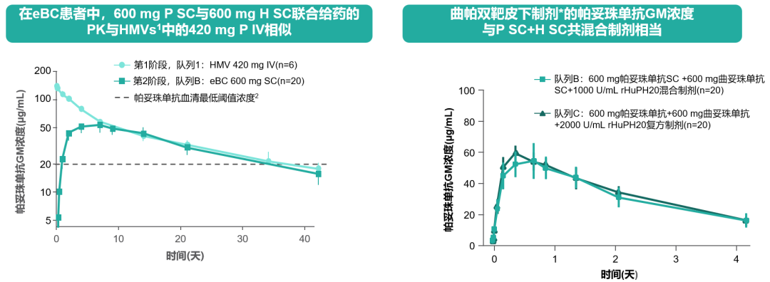 BO30185研究确定了曲帕双靶皮下制剂的剂量标准[15,16],通过健康人群研究确定了帕妥珠单抗SC 1200mg+曲妥珠单抗SC 600mg的负荷剂量以及帕妥珠单抗SC 600mg+曲妥珠单抗SC 600mg的维持剂量;并且在早期乳腺癌患者中,单剂量P-SC单独给药或与H-SC组合(混合或联合配制)的PK相似[15,16]