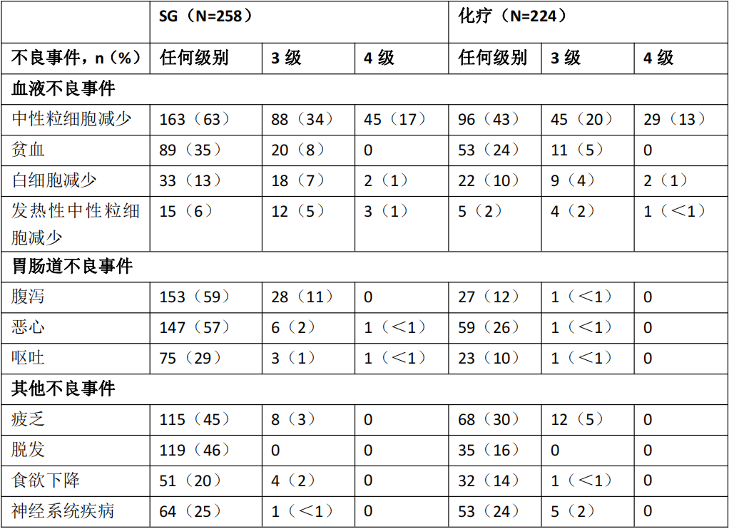 ASCENT研究中SG组与化疗组的安全性表现