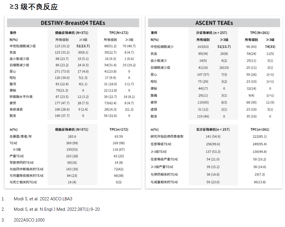 作为获批用于mTNBC的ADC药物,T-DXd与SG之间暂无头对头研究,因此无法直接对比。临床中可通过多方面间接、综合的评估来判断二者在TNBC二线及以上应用的顺序。