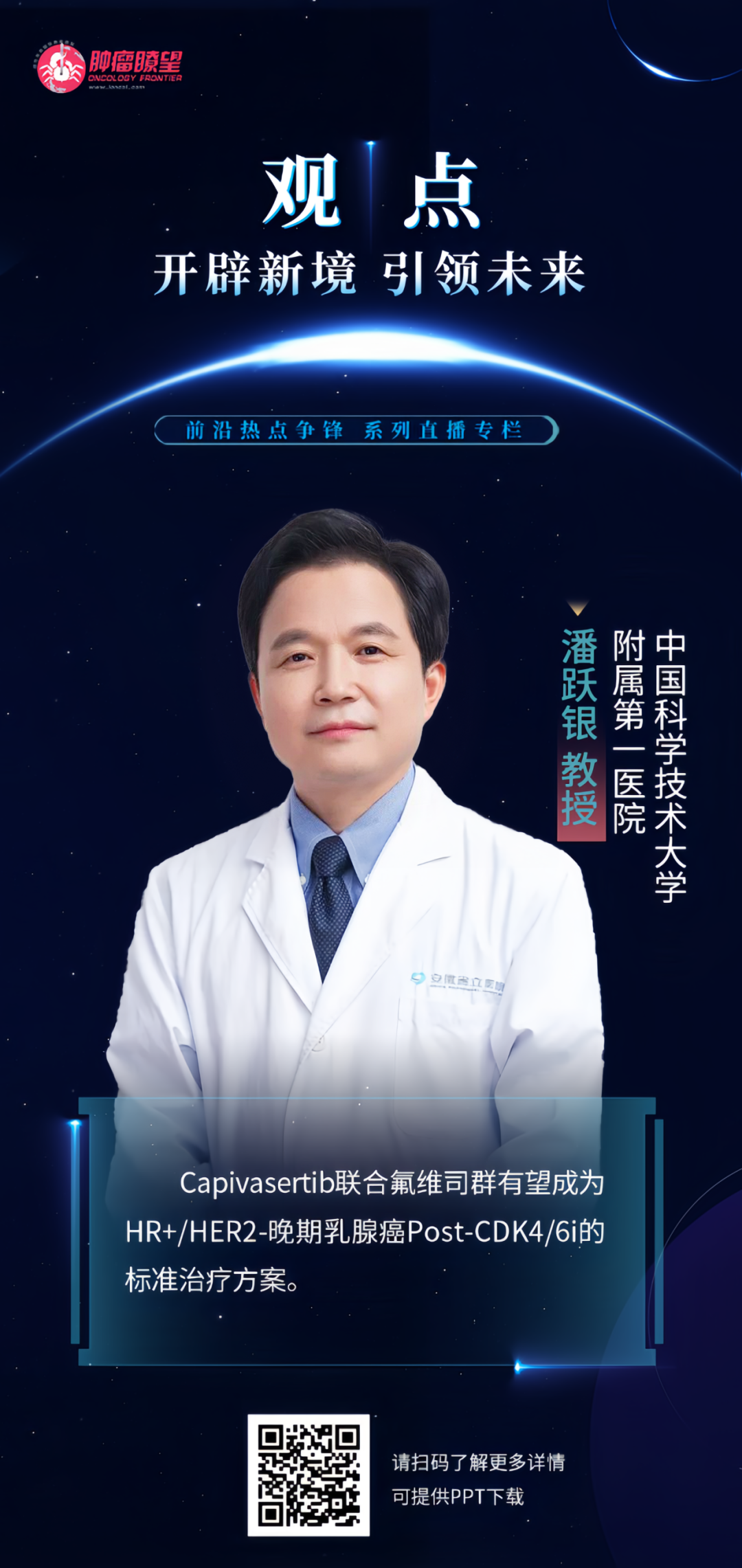 结合临床热点问题及与会专家的分享,潘跃银教授强调:“Capivasertib联合氟维司群有望成为HR+/HER2-晚期乳腺癌Post-CDK4/6i的标准治疗方案。”