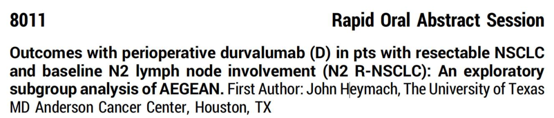 度伐利尤单抗联合化疗在N2可切除非小细胞肺癌患者中的结局——AEGEAN研究亚组探索性结果(摘要号:8011)