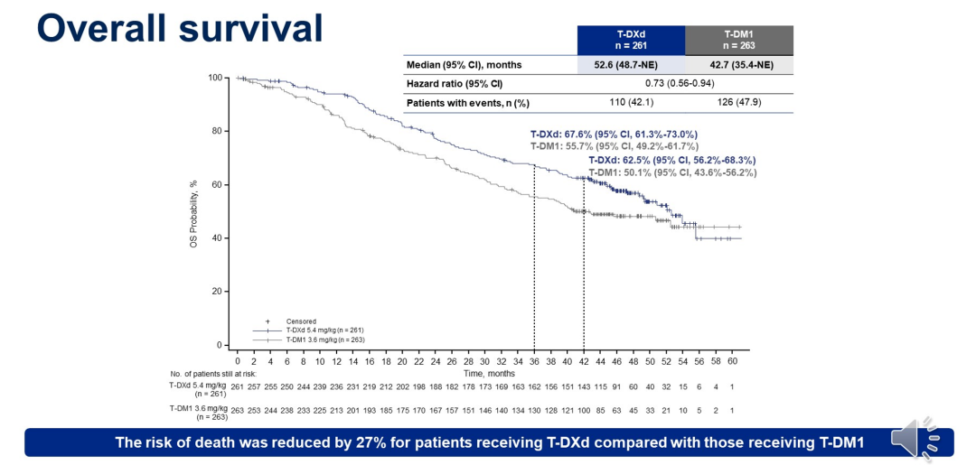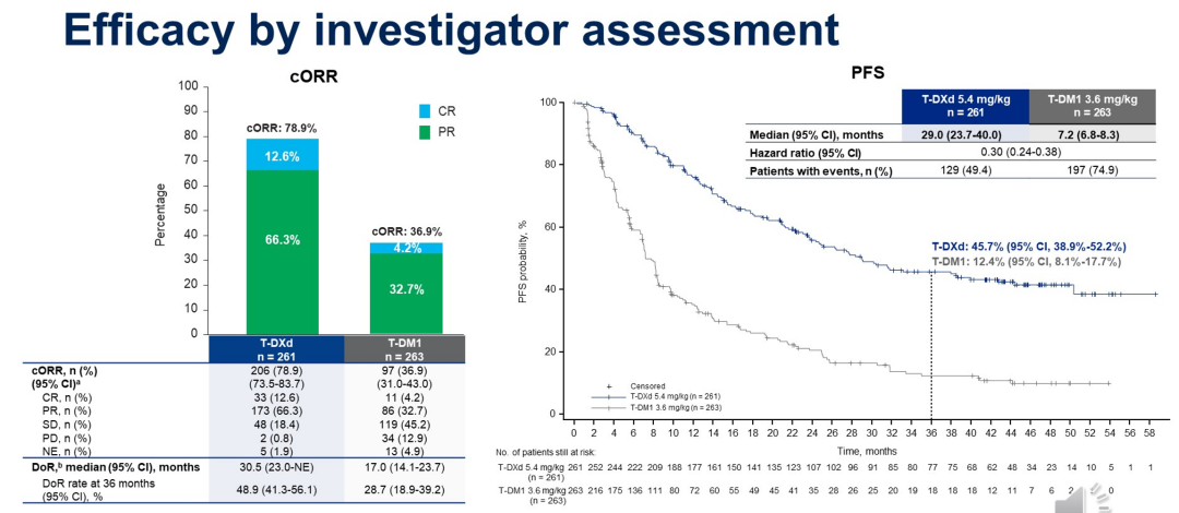 截至2023年11月20日,T-DXd组和T-DM1组的中位随访时间分别为43.0个月和35.4个月。T-DXd组和T-DM1组分别有110例(42.1%)和126例(47.9%)死亡事件,中位OS分别为52.6个月和42.7个月,T-DXd组的死亡风险显著降低27%(HR 0.73);两组的36个月OS率分别为67.6%和55.7%。更新的PFS数据则显示,T-DXd组和T-DM1组的中位PFS分别为29.0个月和7.2个月;24个月PFS率分别为55.8%和20.6%;两组的中位第二次无进展生存期(PFS2)则分别为45.2个月和23.1个月。在疗效方面,T-DXd组和T-DM1组的确认客观缓解率(ORR)分别为78.9%和36.9%,中位持续治疗缓解时间(DoR)分别为30.5个月和17.0个月。