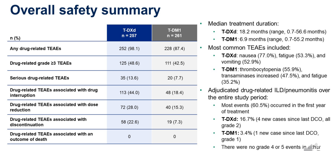 在安全性方面,T-DXd组和T-DM1组的中位治疗持续时间为18.2个月和6.9个月,治疗期间不良事件(TEAEs)发生率与既往报道一致,两组的≥3级TEAEs发生率分别为58.0%和52.1%,严重TEAEs发生率分别为27.6%和22.6%。T-DXd组有16.7%的患者发生任何级别的药物相关间质性肺病/非感染性肺炎(ILD/p),自上一次随访以来,仅增加了4例新事件,且均为2级;T-DM1组的任何疾病药物相关ILD/p发生率则为3.4%,自上次随访以来新增1例1级事件;两组均未发生4级或5级事件。