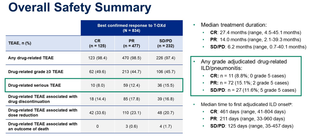 T-DXd疗效好的患者,在安全性方面也表现更好,与PR或SD/PD患者相比,CR患者的药物相关TEAEs发生率(8.0%vs.12.4%vs.15.5%),导致停药的药物相关TEAEs发生率(14.4%vs.17.8%vs.16.8%),以及经裁定的药物相关ILD/p发生率(8.8%[0例死亡]vs.15.1%[2例死亡]vs.11.6%[5例死亡])在数值上均更低,且首次ILD发作的中位时间更长(461天vs.211天vs.125天)。这项汇总分析的结果表明,接受T-DXd治疗而持续缓解的患者,尤其是达到CR的患者,不仅能够转化为PFS和OS生存获益,而且治疗安全性更加长期可控。