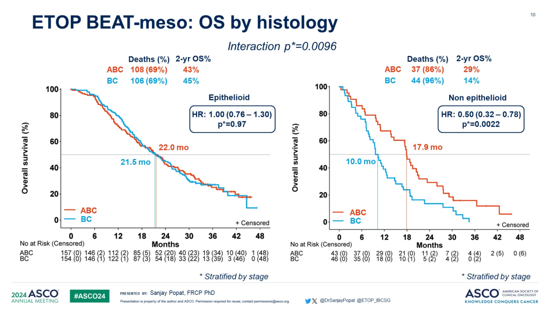 We have nivolumab/ipilimumab upfront as per the Checkmate 743 trial,but it is a regime with crossing of the PFS curve and also the OS curve with early events occurring.And it has an appreciable toxicity profile.With the BEAT-meso regime,the ABC regime,there was a strong survival advantage with ABC for the non-epithelioids,and we did not see the PFS curve or the OS curve crossing over.The adverse event rate was much more comparable to the chemo/IO regime than the IO/IO doublet.One could make the argument that that would be a potential regime for the non-epithelioid group.